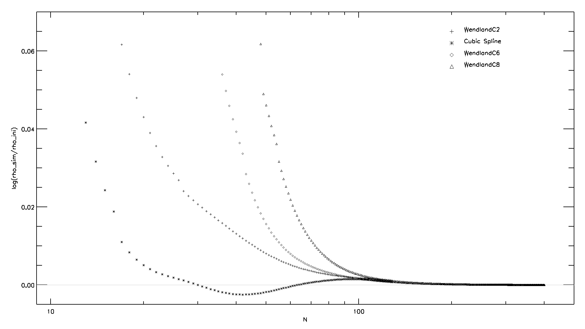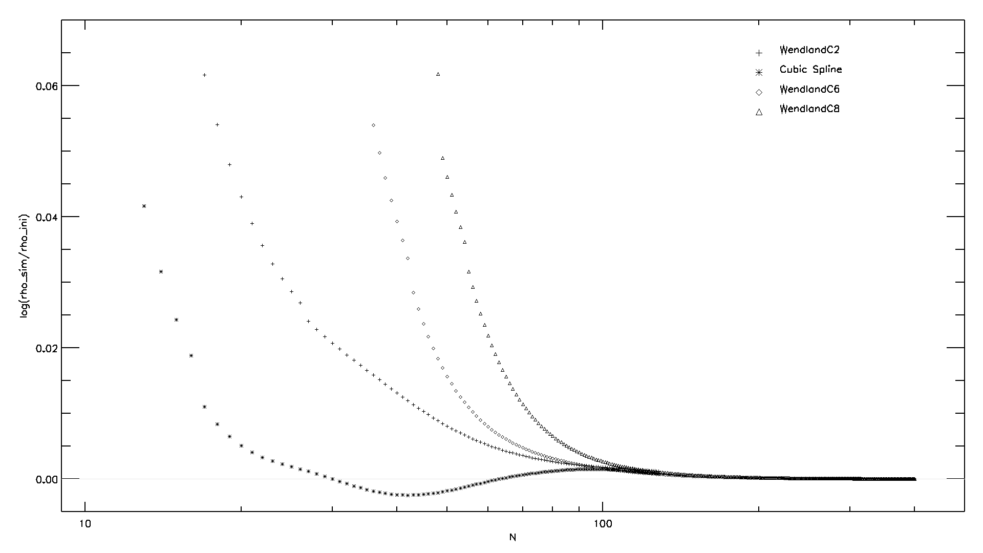 Every setup/combination of kernel, number of neighbors, and initial particle distribution