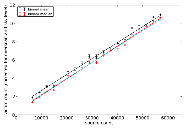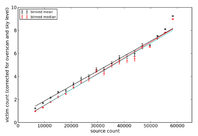 Example exposures (images may show same ccd several times with different scaling to make sources/victims visible), source vs. victim pixel counts show no strong non-linearities: