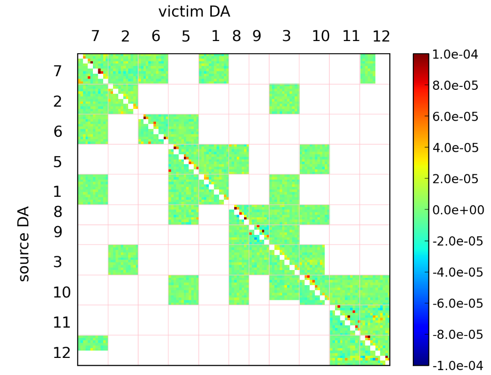 Using average over exposures from 6 different nights (225 exposures with low sky noise) crosstalk coefficients are determined. As there are a lot of pairs to check, start with intra-DA board amp pairs and concentrate on neighboring DA's for inter-DA crosstalk. First matrix exculdes crosstalk coefficients for intra-ccd crosstalk (click on images to get larger version).