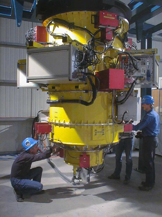 FORS1 montiert an der Teleskopeinheit Nr. 1. Das riesige Instrument verschwindet fast unter den Trägern, die die 53m2 große Spiegelfläche stützen.
