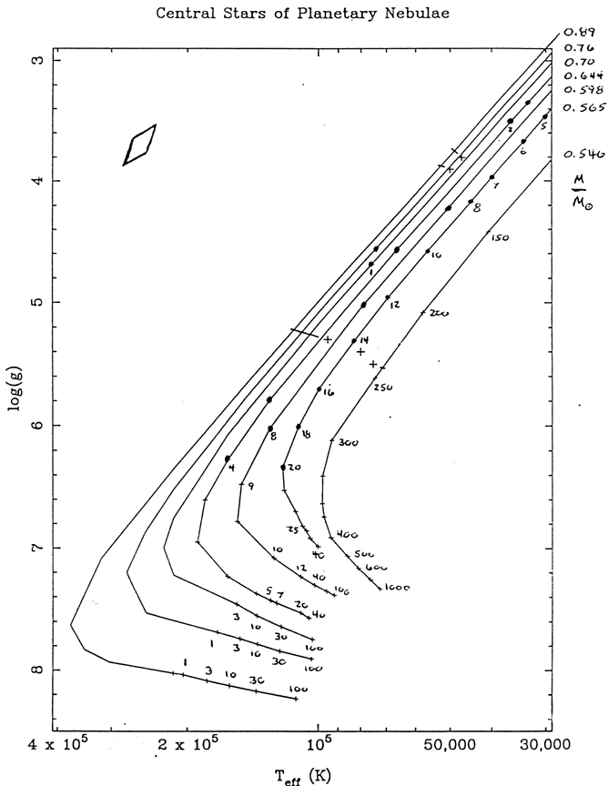 Wie bereits dargelegt ist es bei Kenntnis von Teff und logg des Zentralsterns (hier: mit Zanstra-Methode und photosphärischem Hg) möglich, die ZSPN-Masse durch einen Vergleich mit theoretischen Sternentwicklungsmodellen zu ermitteln.