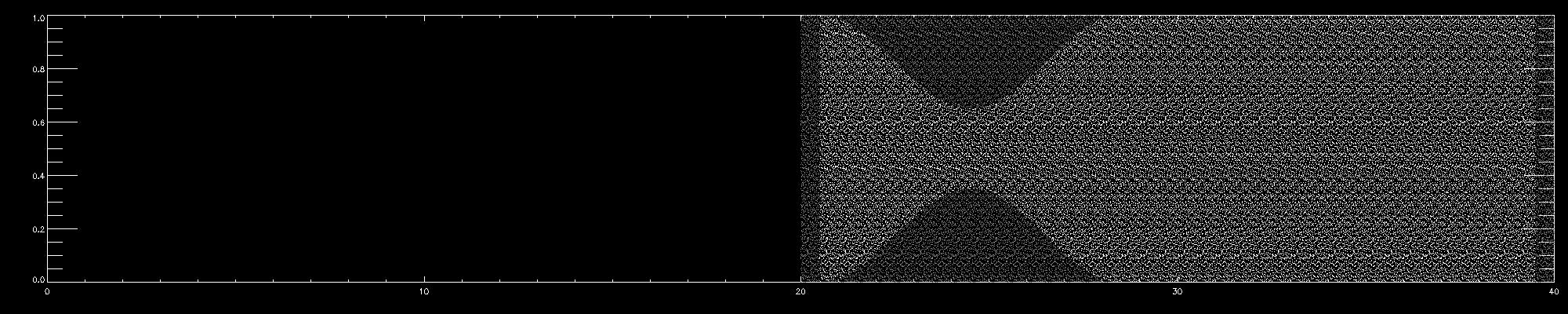= 20 (the time it takes the moving wall traveling at v = 1 to reach the end of the simulation volume)