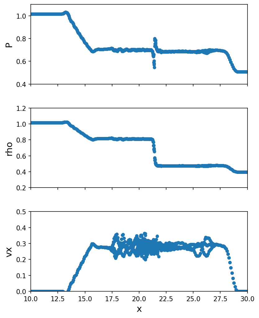 Run a small hydro test problem for a jump in pressure and density. With time, a situation similar to shown