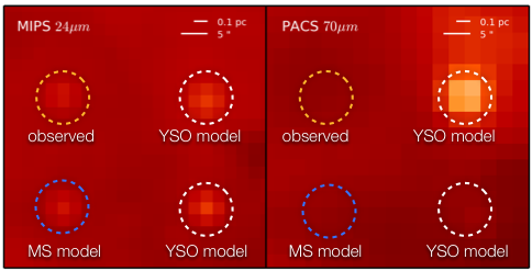 MIPS 24 micron (left) and PACS 70 micron (right) observation with embedded realistic synthetic models of YSOs and evolved stars (MS).